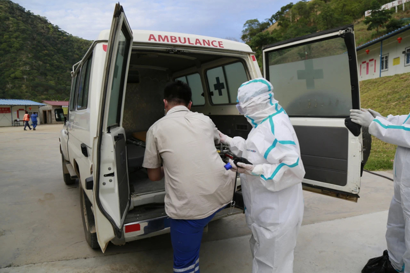 項目部組織疫情防控應急演練,模擬中贊職工發生體溫異常等疑似癥狀后的應急處置步驟,組織項目醫務室人員前往現場進行初步診斷,報告援贊比亞醫療隊進行再次問診,同時做好人員疏散和密切接觸者排查隔離工作,醫護人員及救護車司機等做好全套防護,演練現場秩序井然,步驟合理,提高了項目疫情防控應急管理能力。