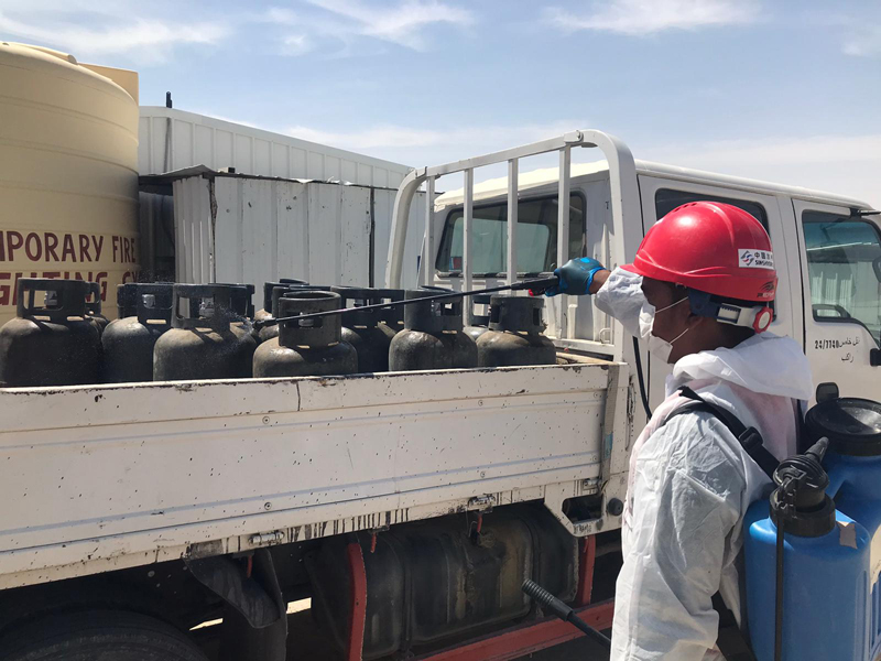 T-1158項目地處沙漠腹地,項目四周全部設置了鐵絲網與外界隔離,項目部因地制宜實行全封閉式管理模式,主抓外防疫情輸入工作。在項目兩個入口處均設立了門禁崗亭,對入場車輛、人員進行嚴格的消殺消毒、體溫監測、登記備案工作,有效降低了輸入性風險。同時,項目部將外籍員工一并納入中方防疫工作體系,旨在徹底消除輸入風險源。增加了臨時居住板房,將外籍勞務人員轉移到項目內集中居住。同時,安排并協調設備供應商和分包商在項目圍欄區內搭設臨時住房,以供其操作手和勞務人員居住,并強制規定所有人員在進入項目后未經批準禁止外出。此外,項目部還制定了嚴格的疫情防控管理流程,分別對主辦公室、現場辦公室、中方人員營地、外方勞務營地、分包商勞務營地五個區域進行網格化管理,安排專人、兼職安全員每天對各區域進行兩次消殺處理。在各區域張貼佩戴防護口罩、一次性手套等門禁標識,定時定點進行覆蓋全員的體溫檢測工作,并登記實時日志,確保項目內部各區域疫情防控工作全覆蓋,營造安全、健康的項目部工作、生活氛圍。